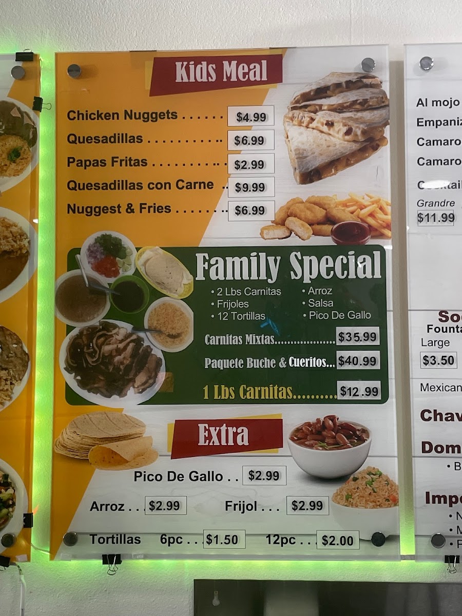 The menu at Carnitas La Piedad Restaurant offers a delightful selection of authentic Mexican dishes, perfect for anyone craving hearty and flavorful meals. The Antojitos Mexicanos section features a variety of tacos, including Tacos Carne Asada, Taco Carnitas, and Tacos Al Pastor, alongside TortaTacos and Burritos. For those looking to add a little extra to their meal, the Extras menu includes options like 6 Tortillas, 12 Tortillas, Frijoles, Pico Gallo, and Arroz. The Combo Plates are great value, with choices like the Costilas Rojas Combo, Carne Asada Combo, Costilas Verde Combo, and Carnitas Combo. For carnitas lovers, the restaurant offers a variety of specialized cuts under the Carnitas section, such as 1 Lb Carnitas, 1 Lb Mixed, and 1 Lb Buche/Cuerito. The Carnitas Specials are perfect for a larger appetite, with dishes like Carnitas Special, Medio Paquete, Buche/Cuerito Paquete, and Carnitas Mixtas Paquete. To wash it all down, customers can enjoy Mexican Soda, Jarrito, and Aguas Frescas, providing a refreshing complement to the rich flavors of the meal. Overall, Carnitas La Piedad offers a wide array of flavorful and satisfying options at reasonable prices, making it a standout in Coachella for anyone craving authentic Mexican cuisine.